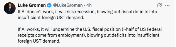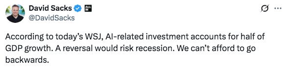 Ludicrous to think in a capitalist society, but true. Some AI companies are already asking for a federal “backstop/bailout” if it doesn’t work, like OpenAI, even if they now deny it. What does this all mean? The fiat ponzi show must go on at all costs. A steep and sustained >20% market correction is intolerable to the government at this point. This is not debatable. Tax receipts MUST stay elevated to fund the government.