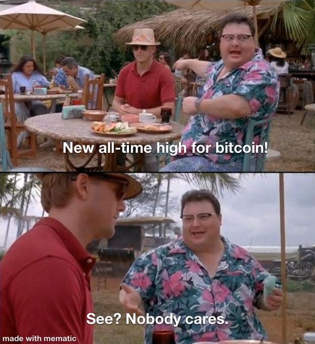 A primary reason I write this newsletter is to reassure myself and embolden my conviction in bitcoin when times are tough. If I help others out while doing so, great. There’s a reason people call bitcoin “the hardest trade.” It helps me to write down everything I believe to be true at the time to make sense of it all (or at least attempt to) and stay invested.