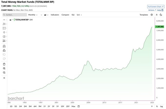 As interest rates gradually decline (a 2-3% target, I predict), the $7 trillion in money market funds getting ~4-5% now will seek to move elsewhere as yields drop to earn a higher return than inflation (2-3%).