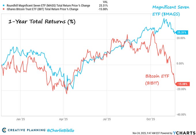 Everyone is flipping out about bitcoin down ~30%, but most stocks besides AI-related plays are down this year too. The Mag7 stocks are pulling the big indexes up single-handedly. It’s a one-sided trade this year. This is bound to reverse at some point.